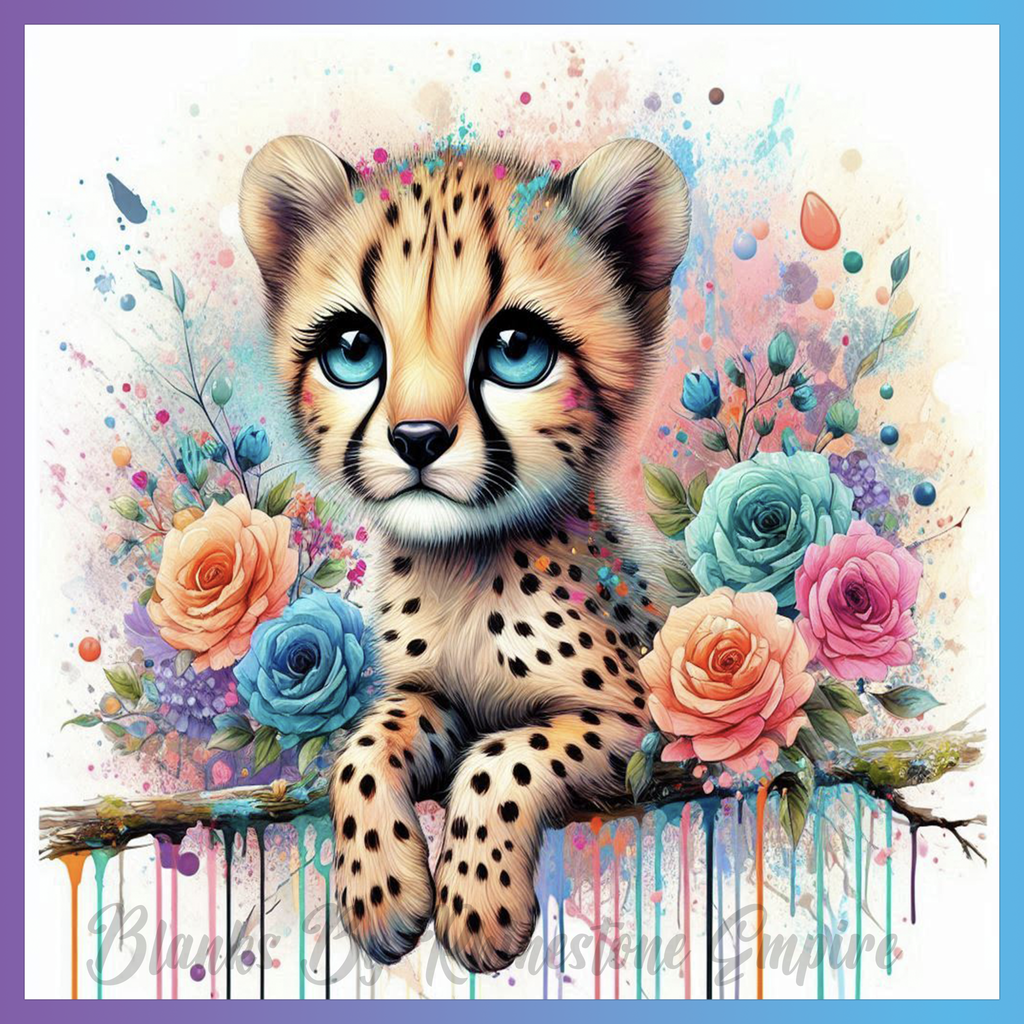 Theme: Cheetah with flowers, colorful, cute, portrait.