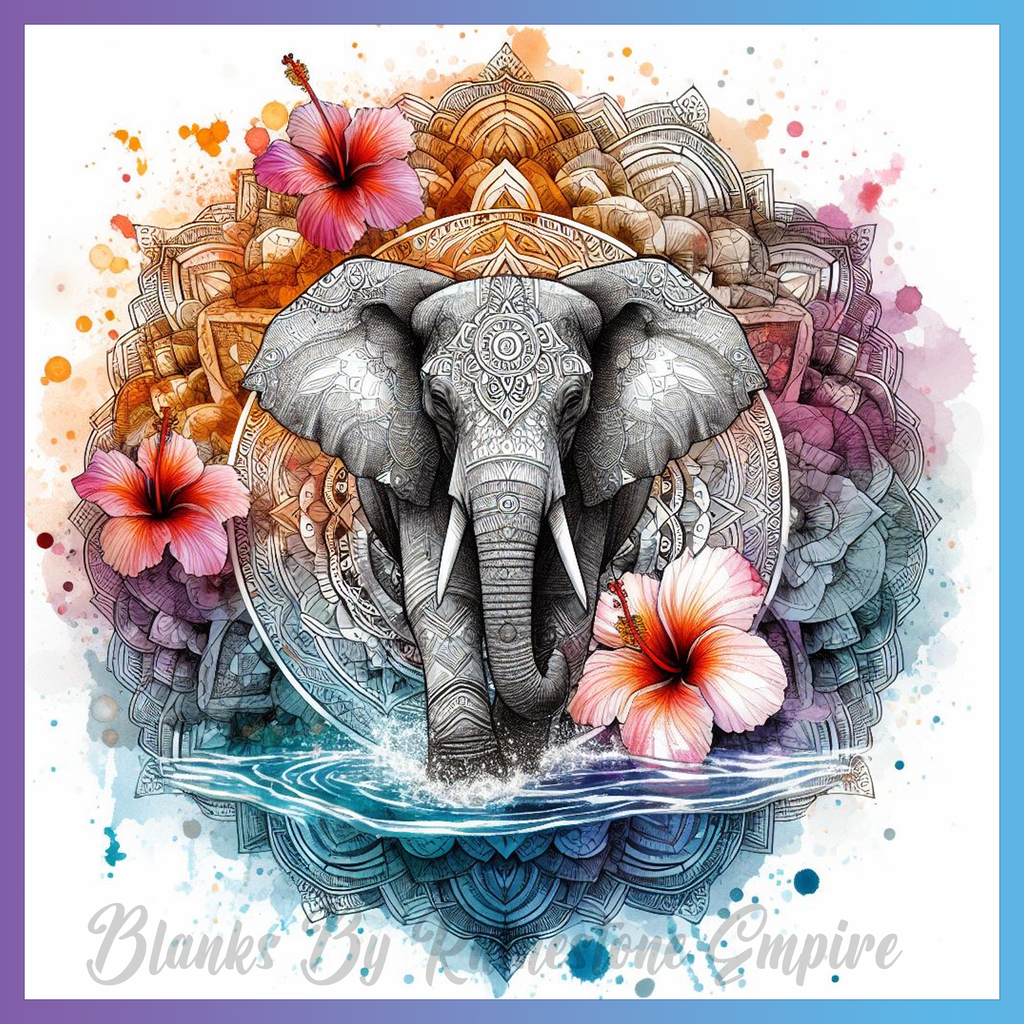 Theme: Elephant with mandala, flowers, water, colorful.