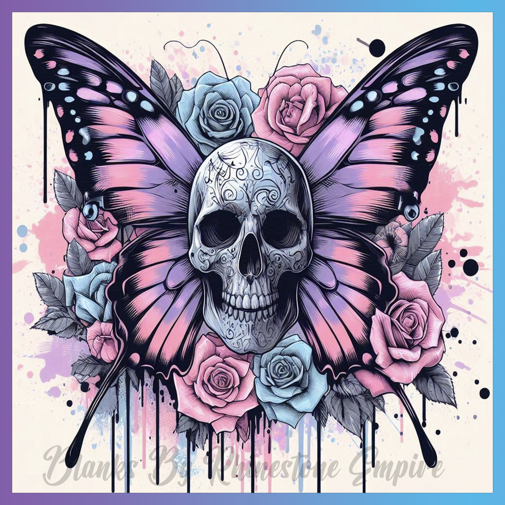 Theme: Skull with butterfly, roses, ornate, colorful.