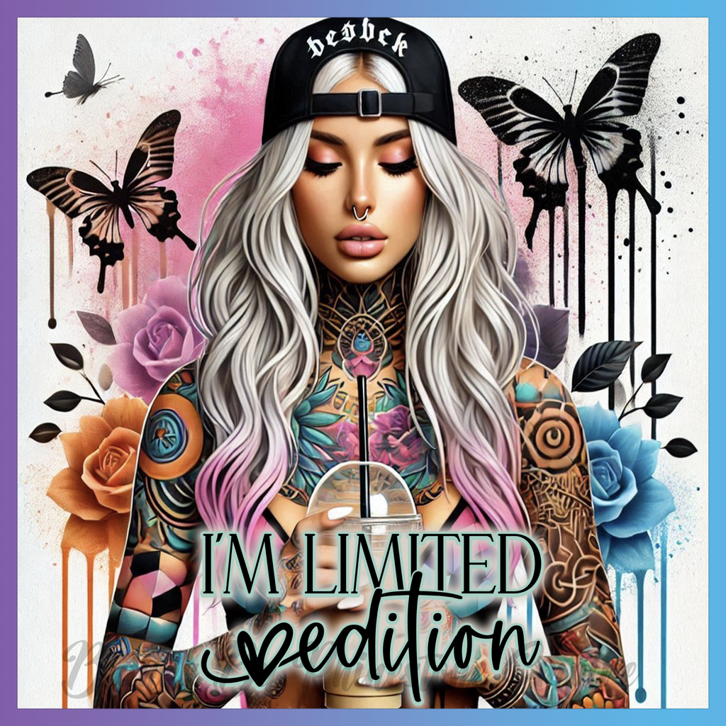 Theme: Girl with tattoo, butterflies, flowers, colorful.