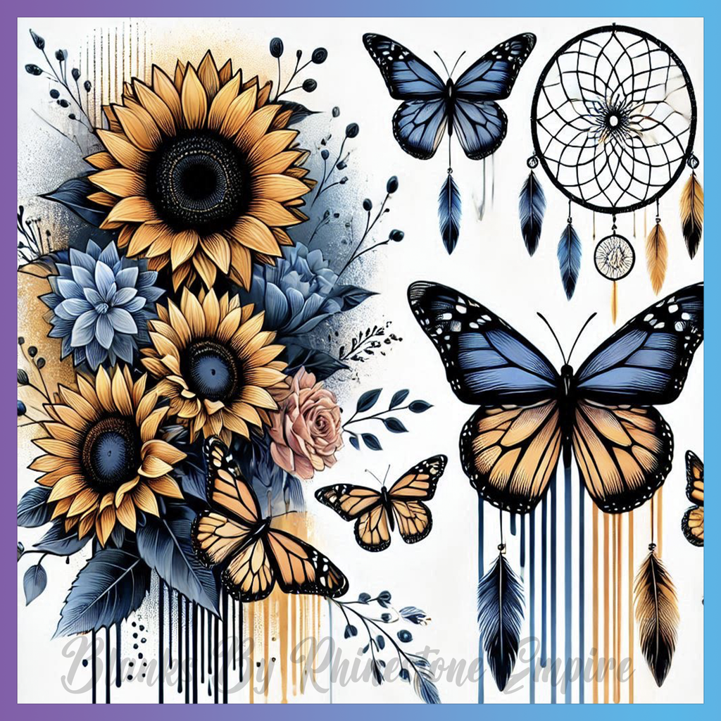 Theme: Butterfly with flowers, sunflowers, dreamcatcher, blue.