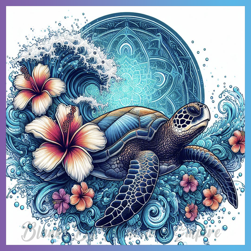 Theme: Turtle with ocean, waves, flowers, mandala.
