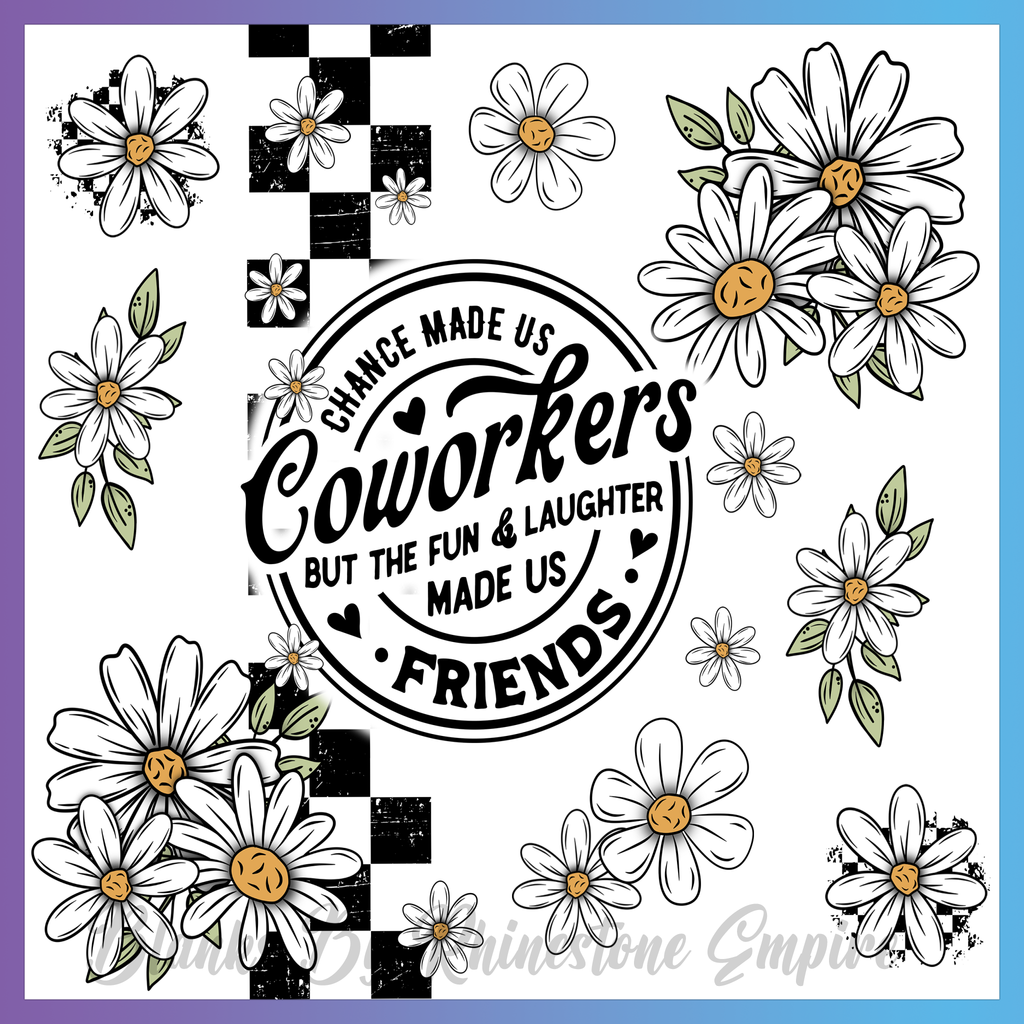 Theme: Friends with daisies, text, black and white, graphic design.