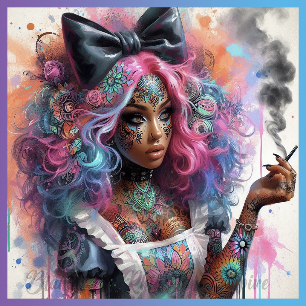 Theme: Girl with tattoo, colorful, smoke, bow.
