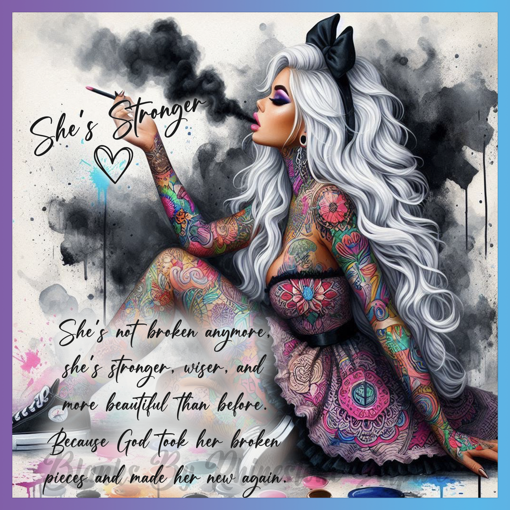 Theme: Girl with tattoo, long hair, smoking, colorful.