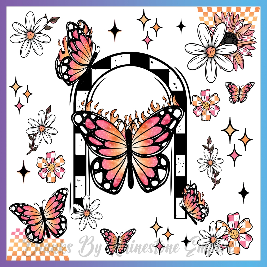 Theme: Butterfly with flowers, stars, checkered, pink.