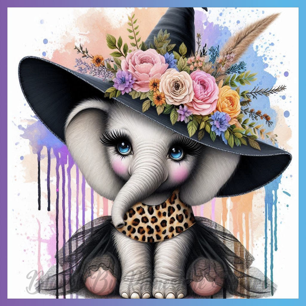 Theme: Elephant with hat, flowers, tulle, leopard print.