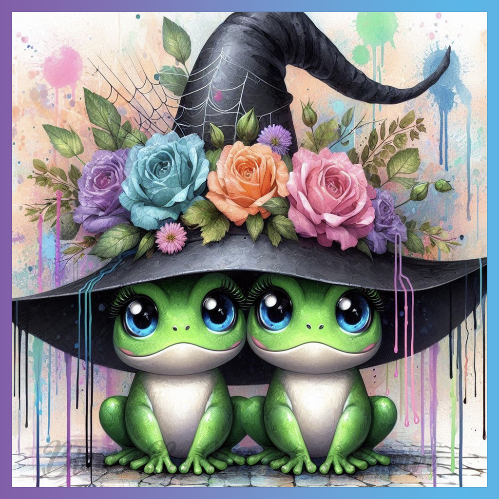 Theme: Frog with hat, flowers, cartoon, colorful.