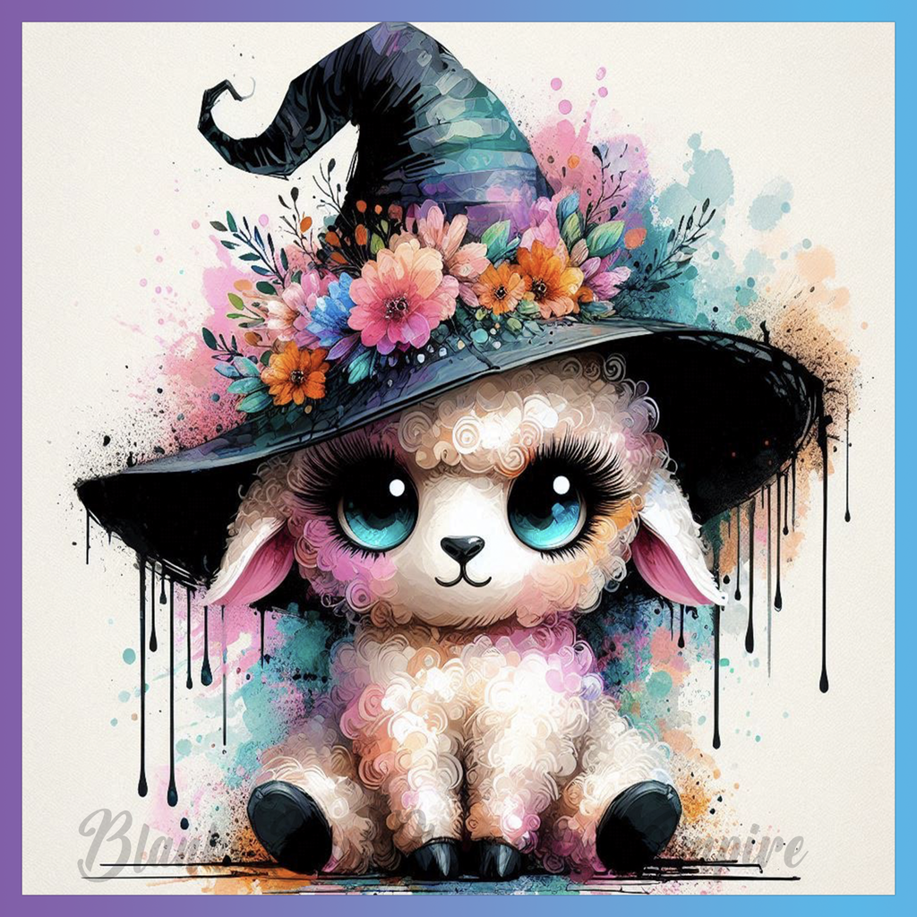 Theme: Lamb with witch hat, flowers, colorful, cute.