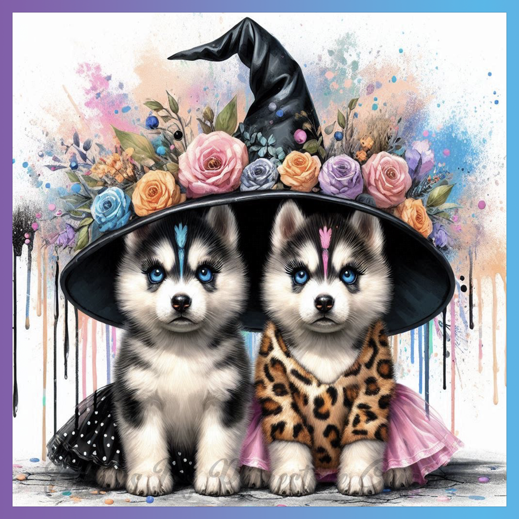 Theme: Puppies with hats, flowers, costumes, whimsical.
