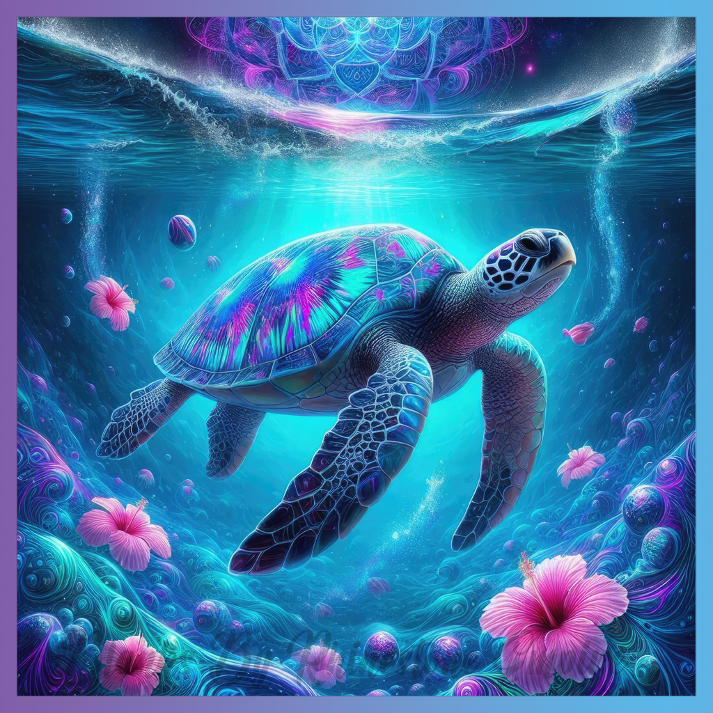 Theme: Turtle with ocean, flowers, colorful, abstract.