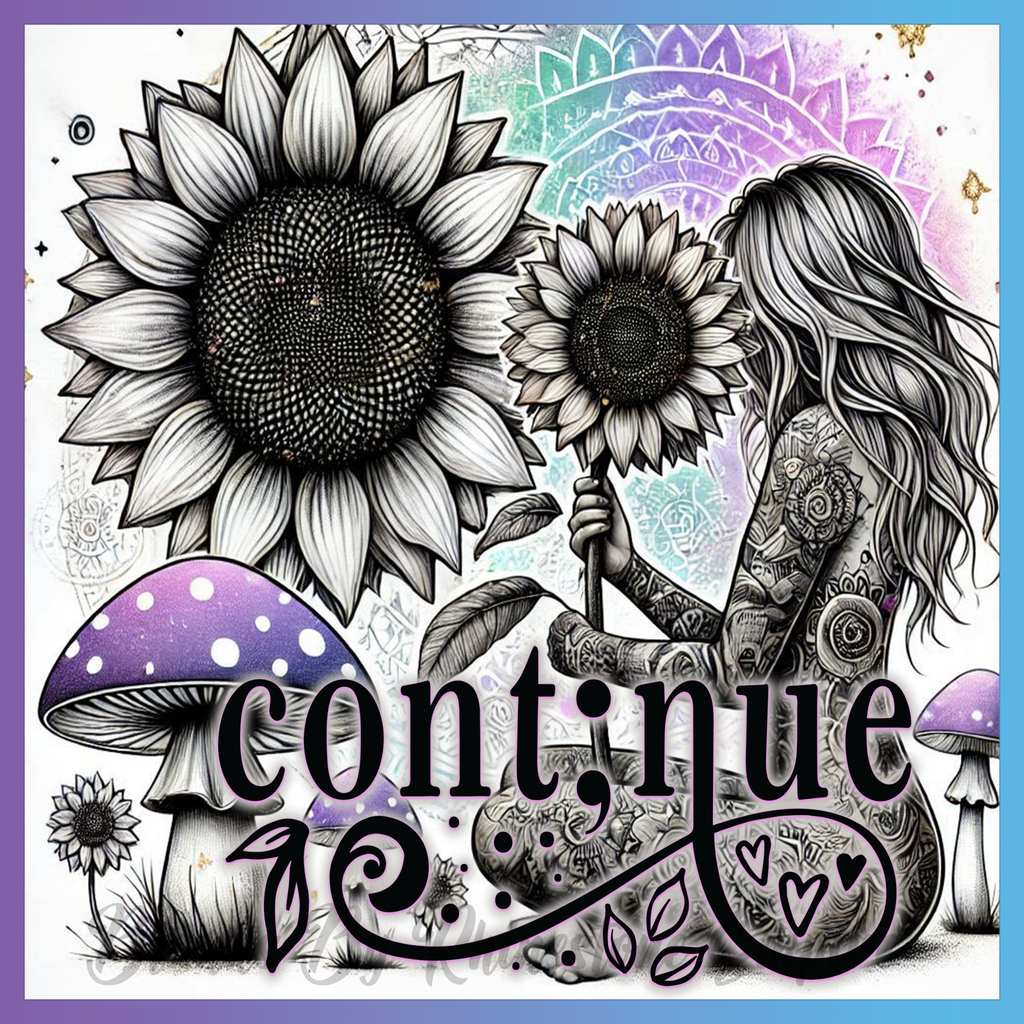 Theme: Girl with tattoo, sunflower, mushrooms, flowers.