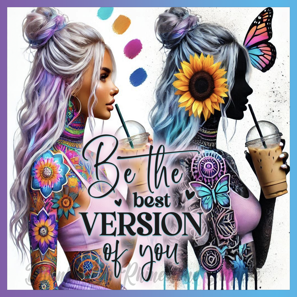 Theme: Girl with tattoo, flowers, butterfly, drink.