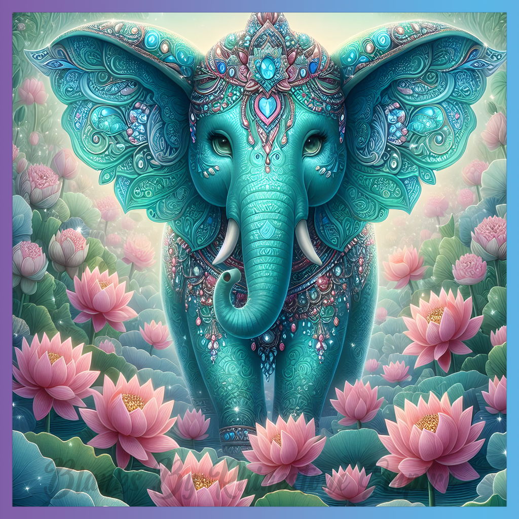 Theme: Elephant with lotus, ornate, jewels, flowers.