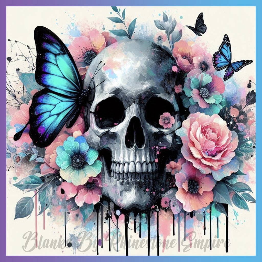 Theme: Skull with butterfly, flowers, colorful, art.