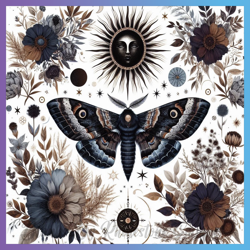 Theme: Moth with flowers, sun, moon, stars.
