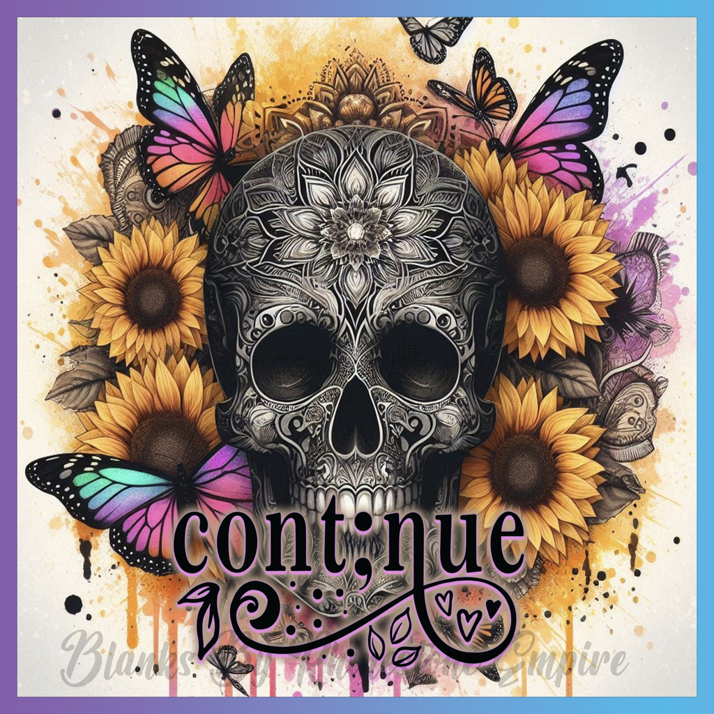 Theme: Skull with butterflies, sunflowers, ornate, colorful.