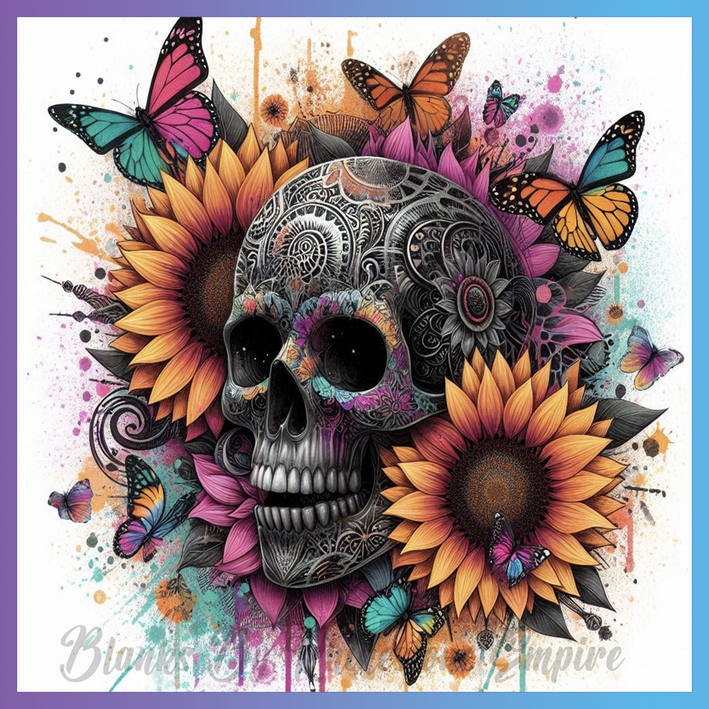 Theme: Skull with butterflies, sunflowers, colorful, ornate.