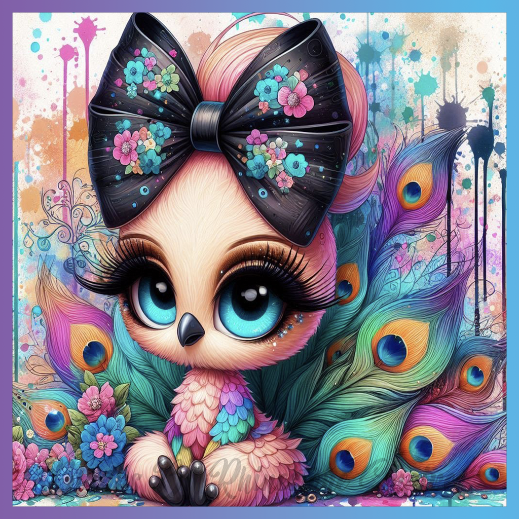 Theme: Bird with colorful, bow, peacock feathers, flowers.