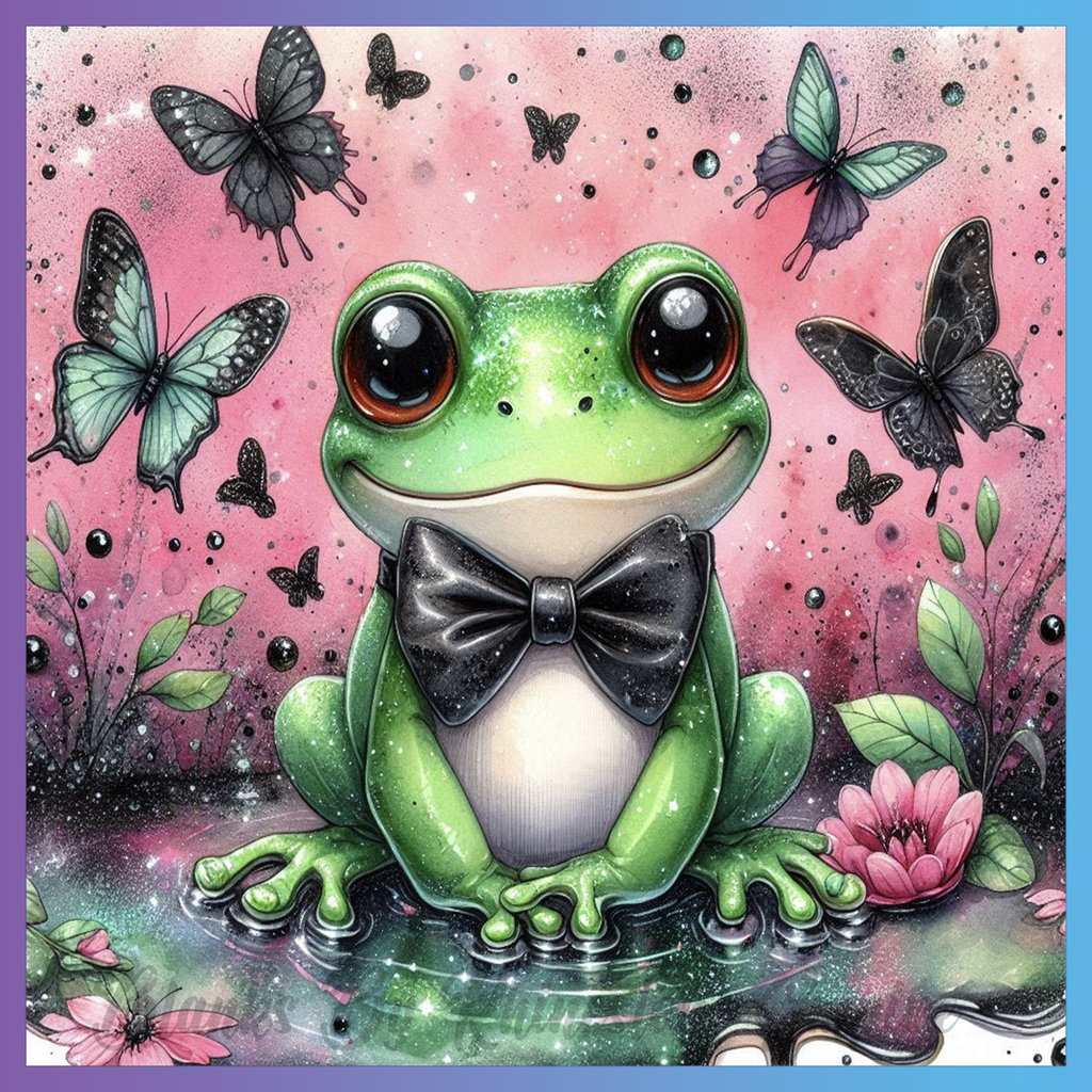 Theme: Frog with bowtie, butterflies, flowers, pink background.