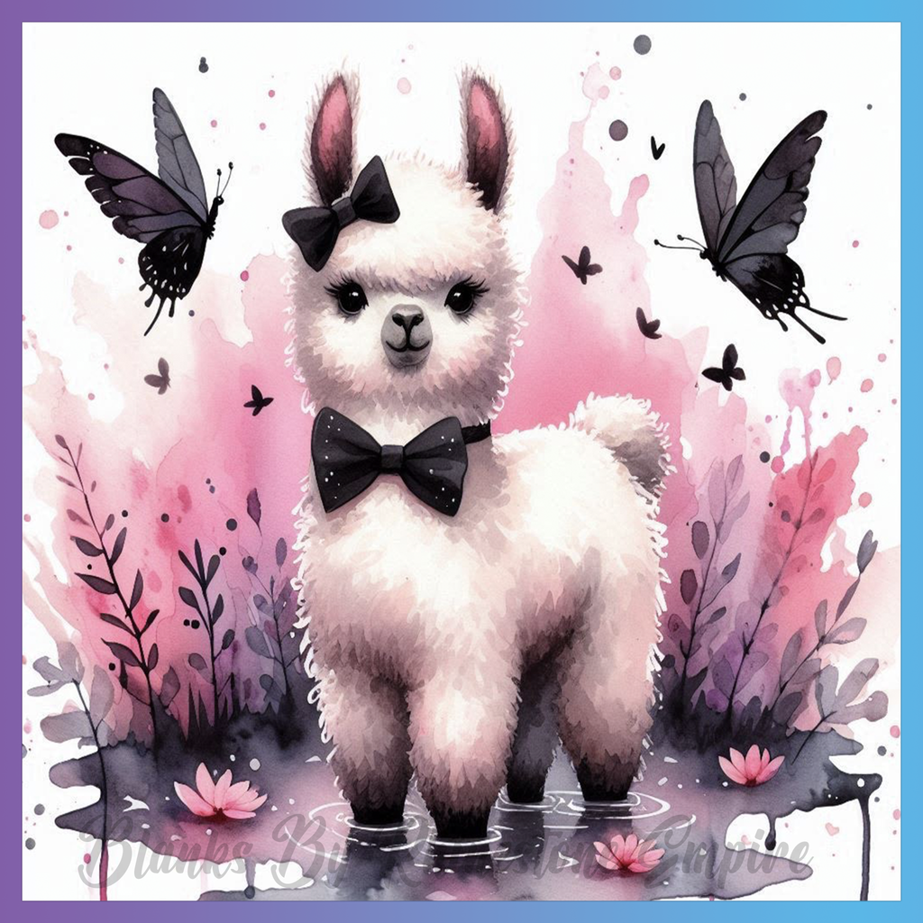 Theme: Llama with butterflies, watercolor, flowers, bow.