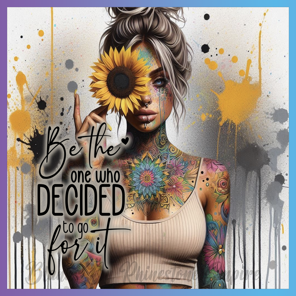 Theme: Girl with tattoo, sunflower, colorful, art.