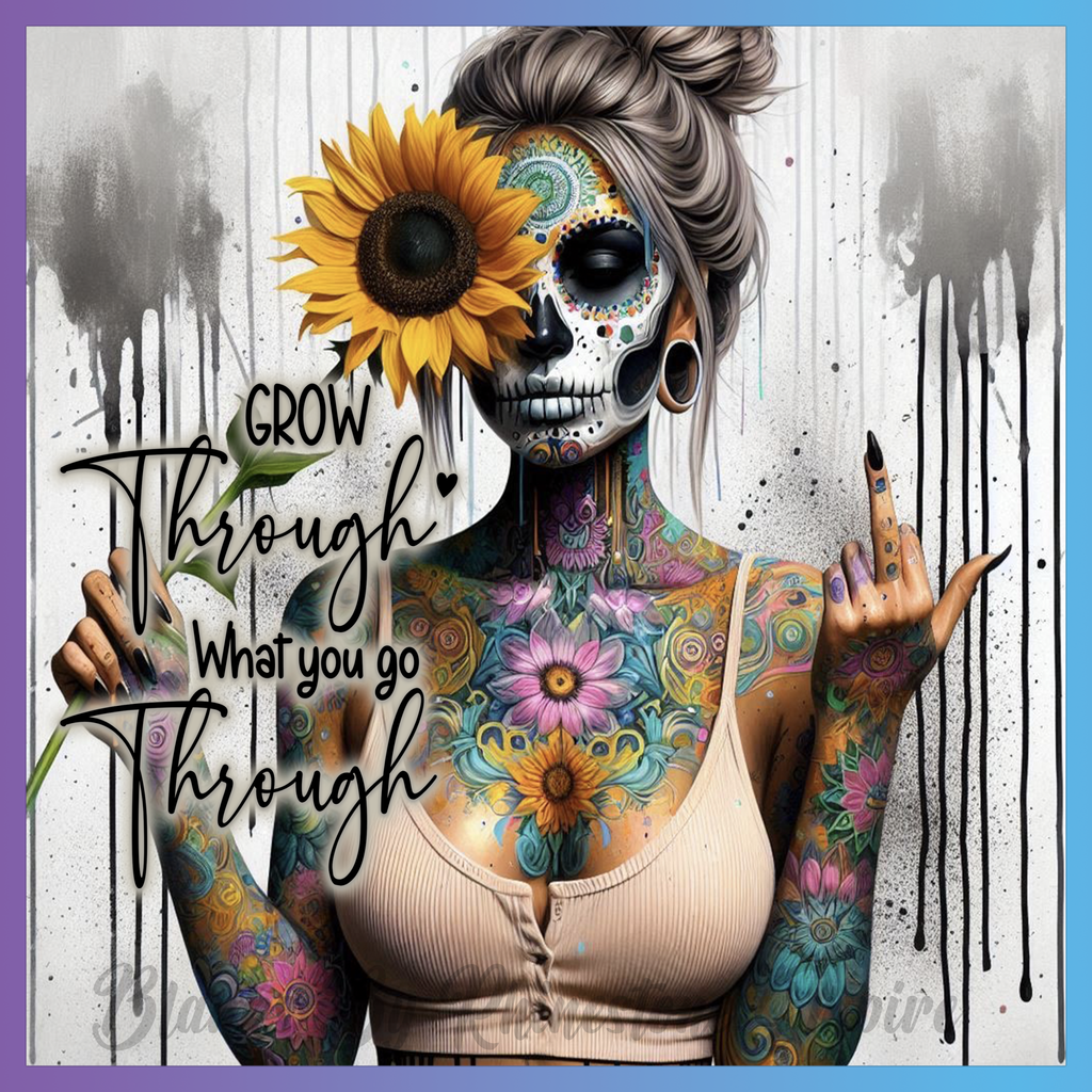 Theme: Girl with tattoo, skull, sunflower, flowers.