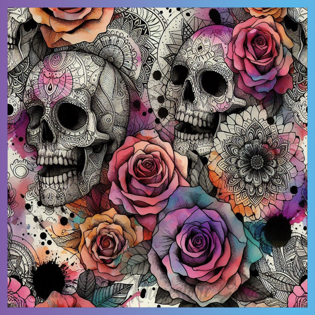 Theme: Skull with roses, mandala, colorful, detailed.