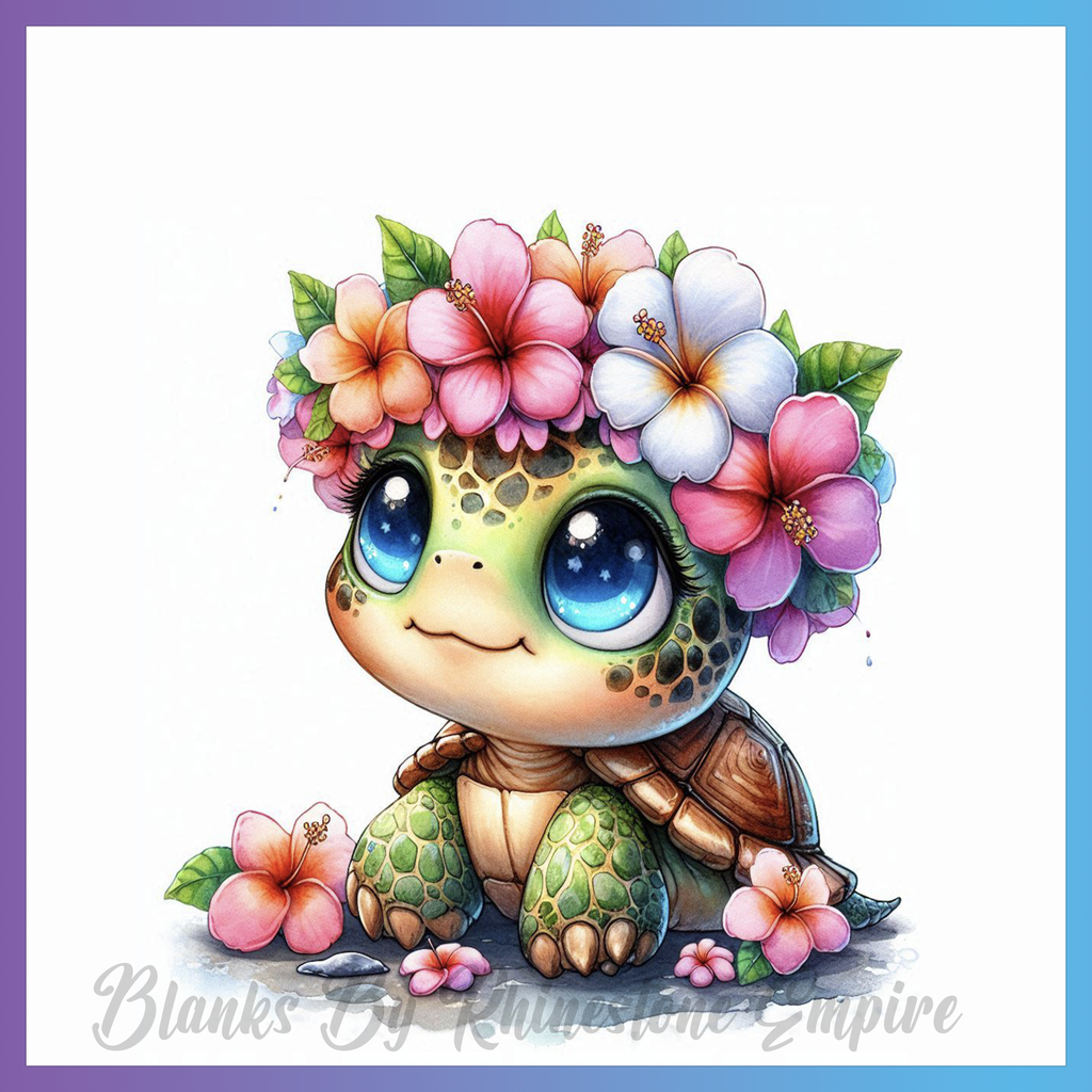 Theme: Turtle with flowers, cute, smiling, cartoon.