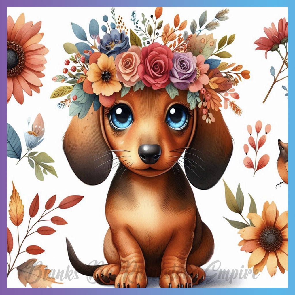 Theme: Dog with flowers, floral crown, cute, autumn leaves.