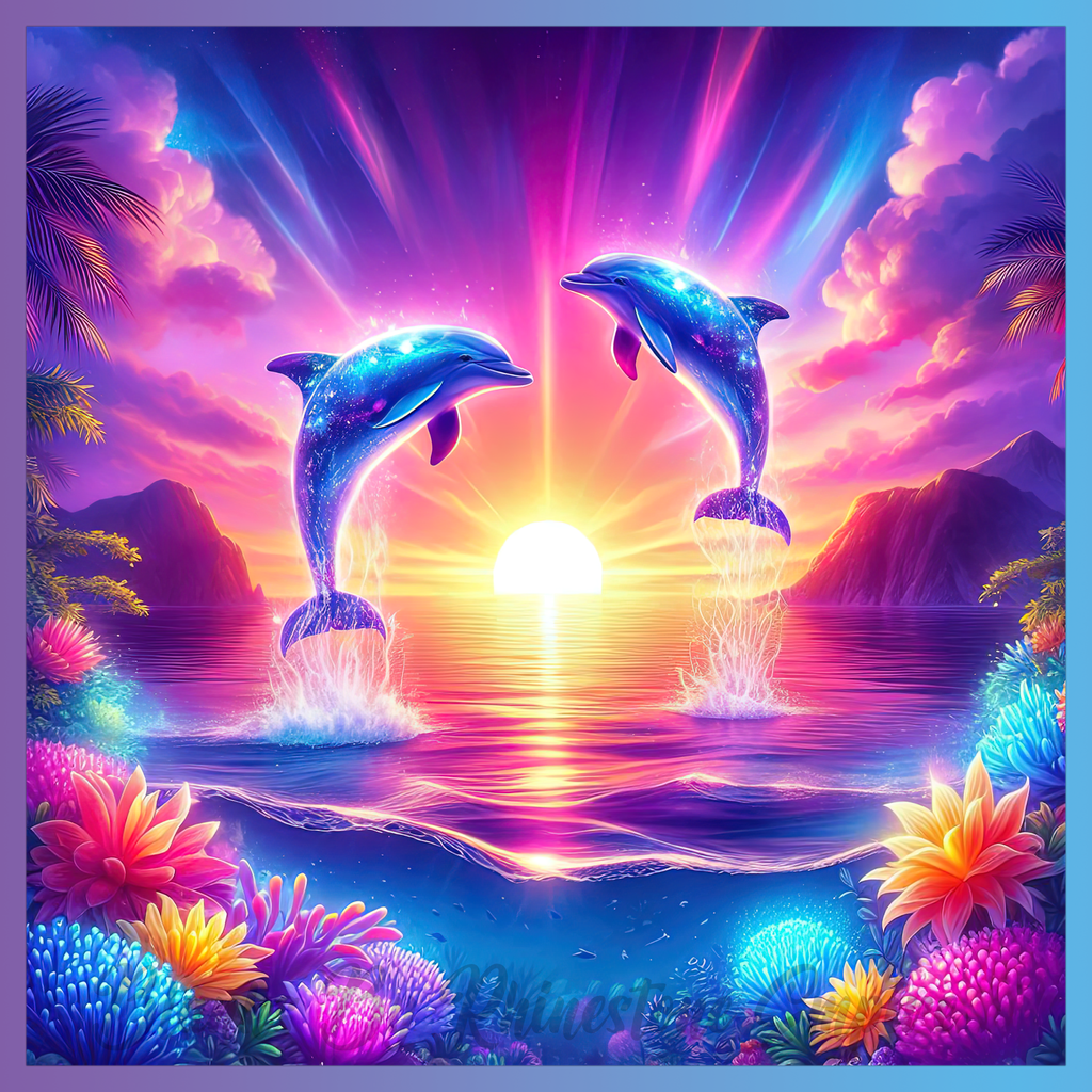 Theme: Dolphin with sunset, ocean, colorful, tropical.