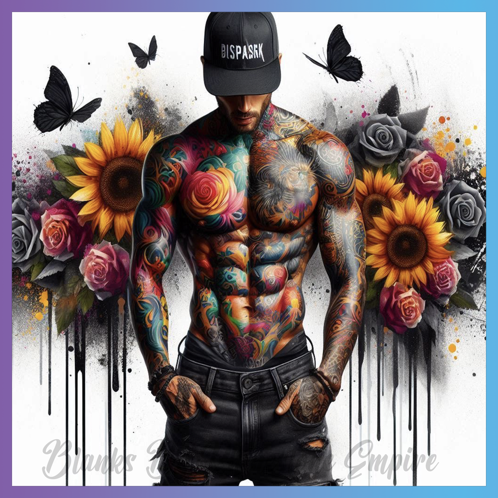 Theme: Man with tattoo, flowers, butterflies, colorful.
