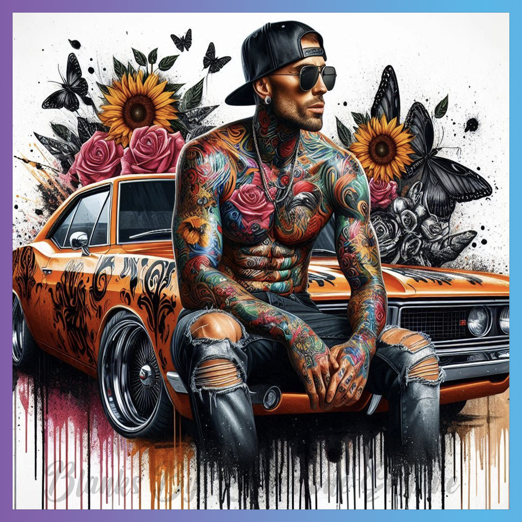 Theme: Man with tattoo, car, flowers, butterflies.