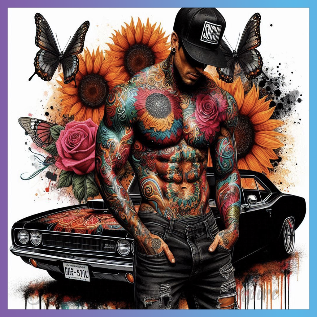 Theme: Man with tattoos, muscles, sunflowers, roses.
