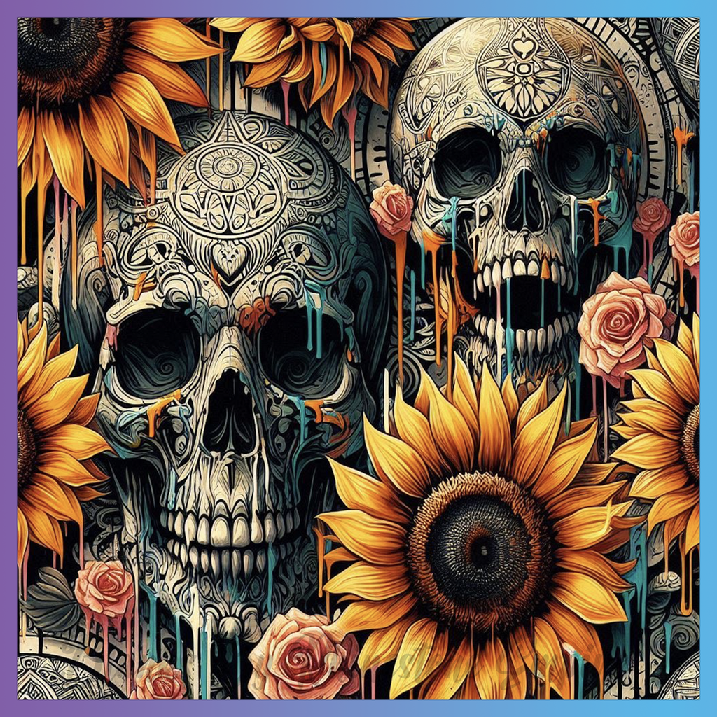 Theme: Skull with sunflowers, roses, ornate, colorful.