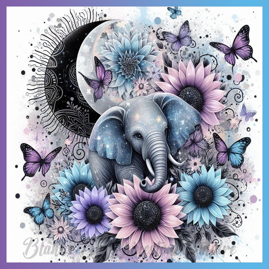 Theme: Elephant with flowers, butterflies, moon, abstract.