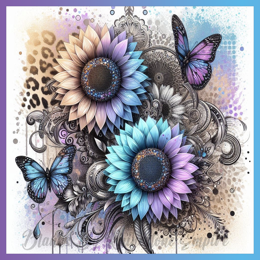 Theme: Flower with sunflower, butterfly, abstract, colorful.