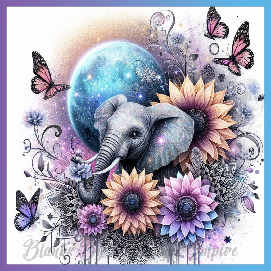 Theme: Elephant with flowers, butterflies, moon, galaxy.
