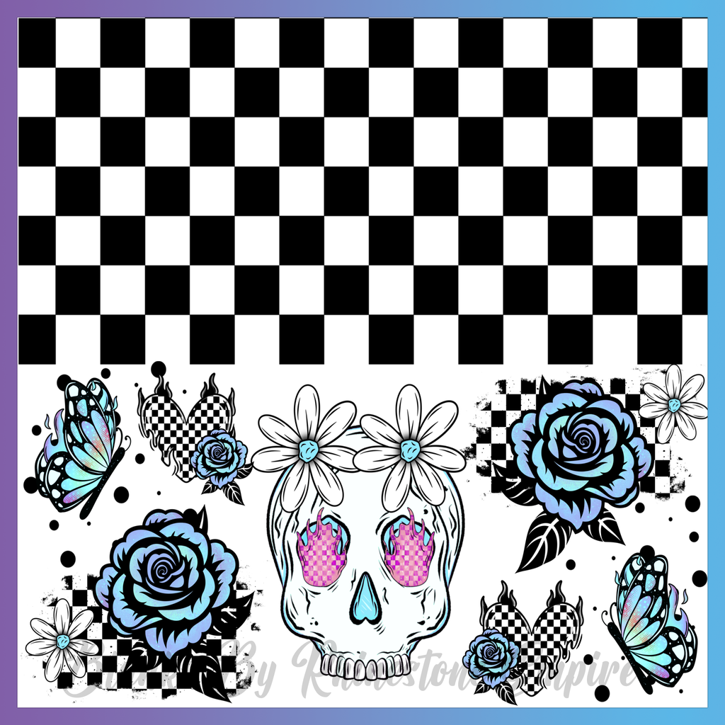 Theme: Skull with flowers, butterflies, checkered, blue.