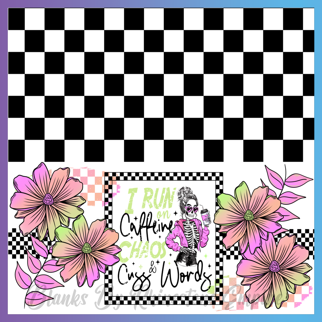 Theme: Skeleton with flowers, checkered, text, colorful.