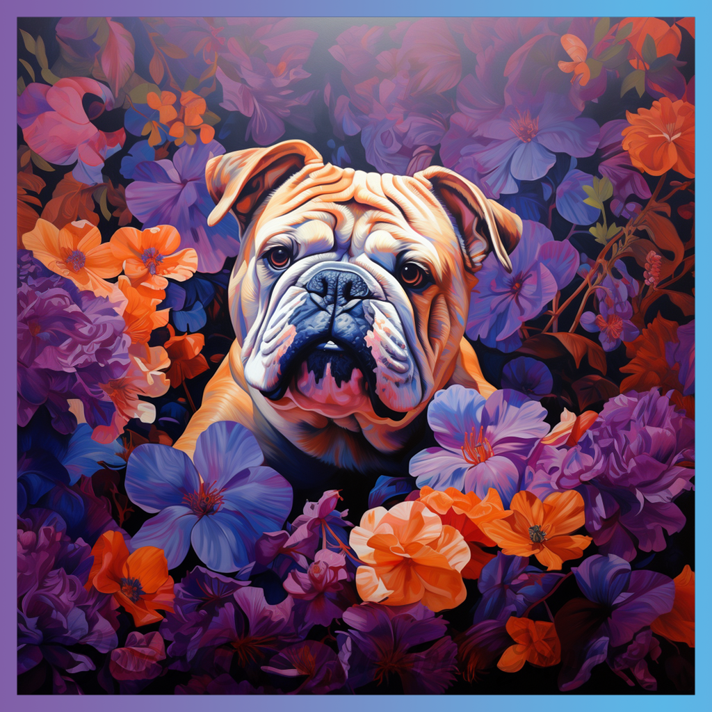 Theme: Dog with bulldog, flowers, vibrant, colorful.