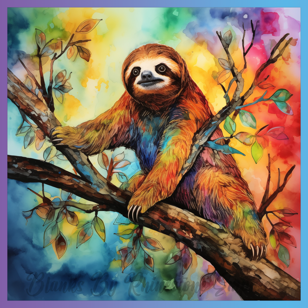Theme: Sloth with colorful, tree, leaves, vibrant.