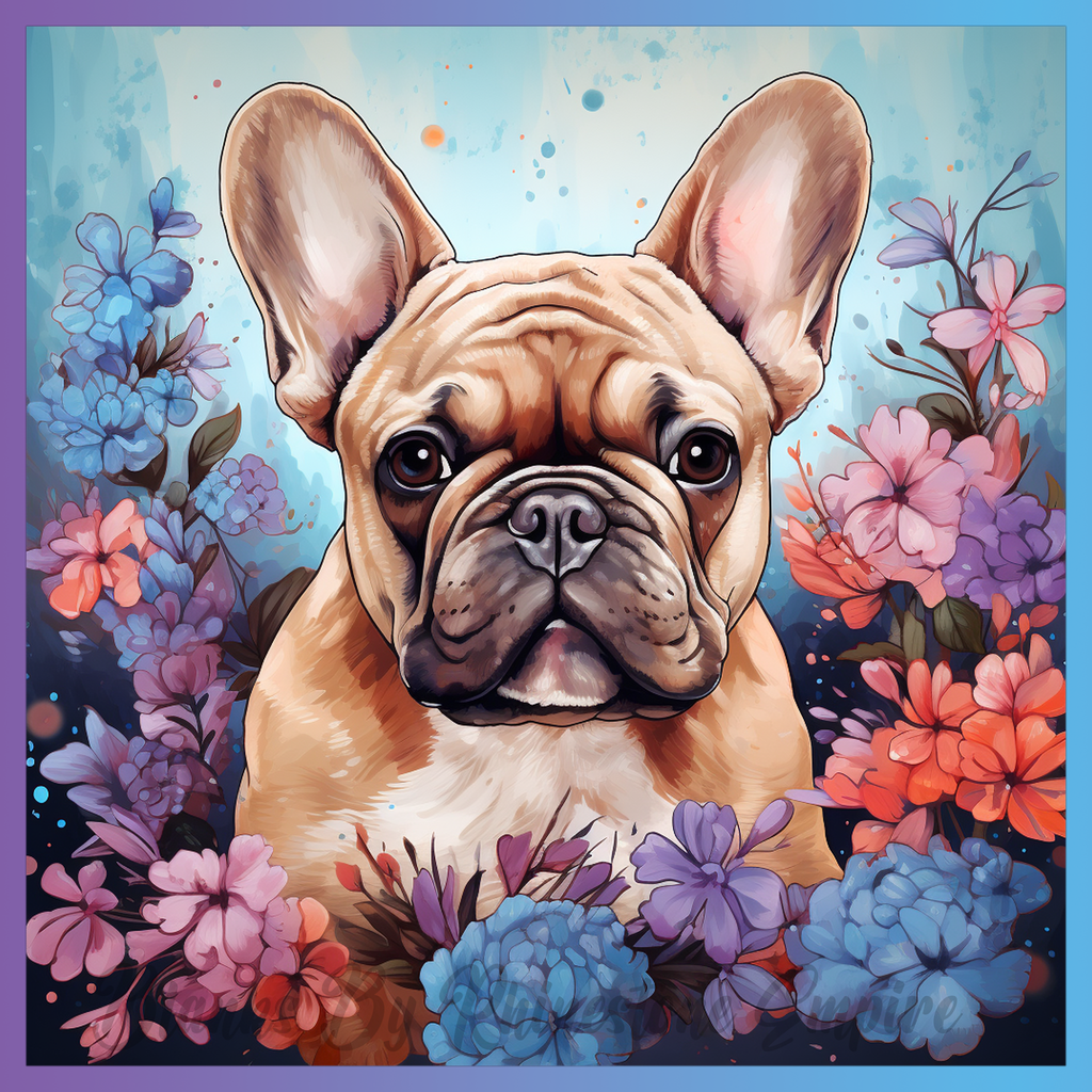 Theme: Dog with French Bulldog, flowers, colorful, portrait.