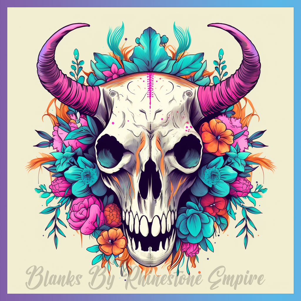 Theme: Skull with horns, flowers, colorful, illustration.