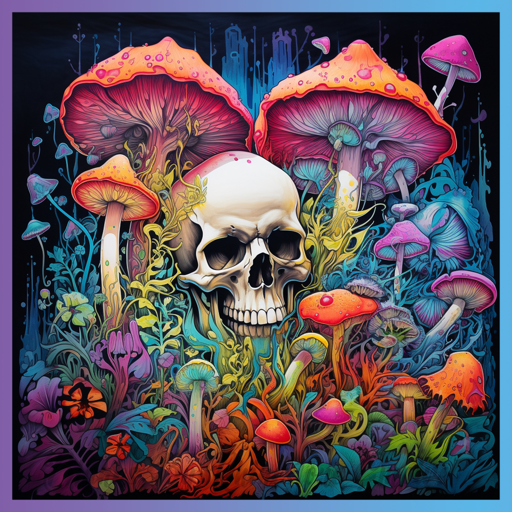 Theme: Skull with mushrooms, colorful, flowers, nature.
