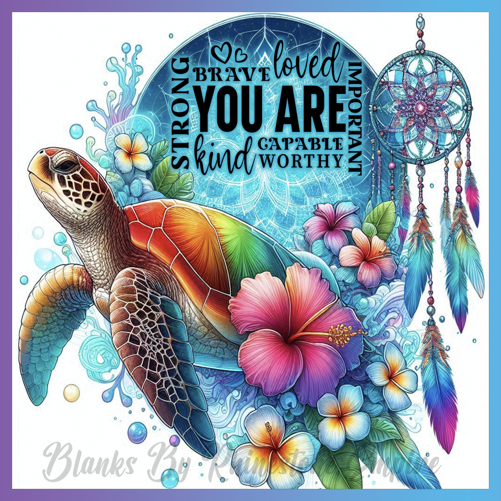 Theme: Turtle with colorful, flowers, dreamcatcher, ocean.