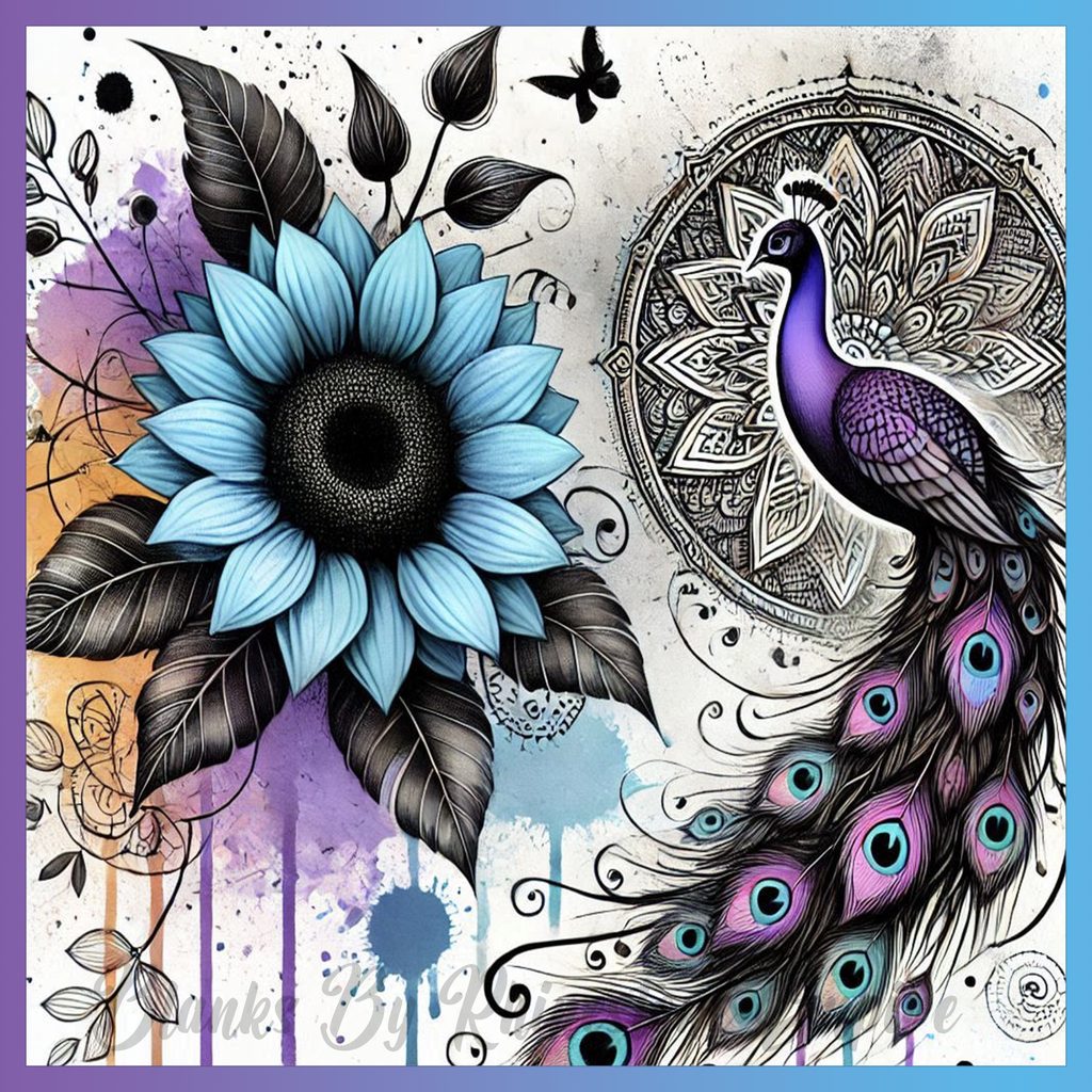 Theme: Peacock with flower, mandala, colorful, abstract.