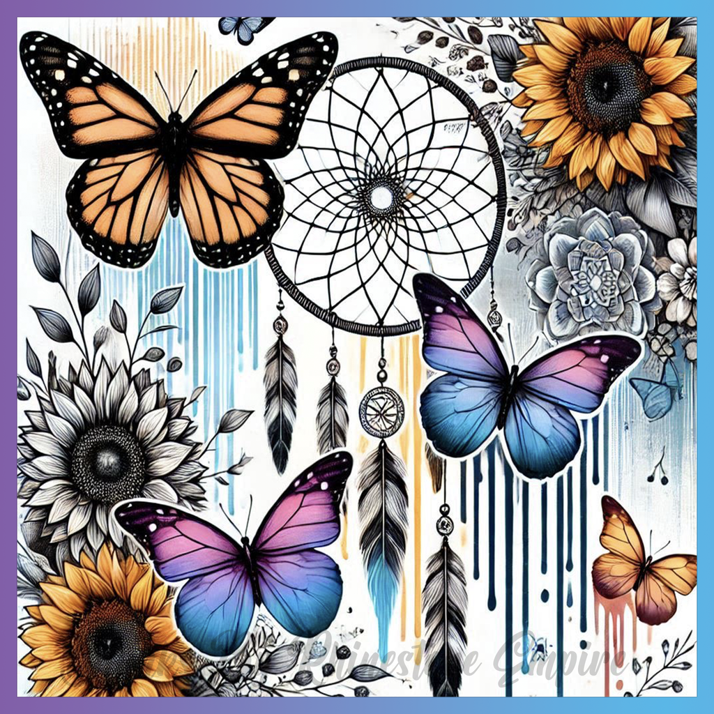 Theme: Butterfly with dreamcatcher, sunflowers, flowers, feathers.