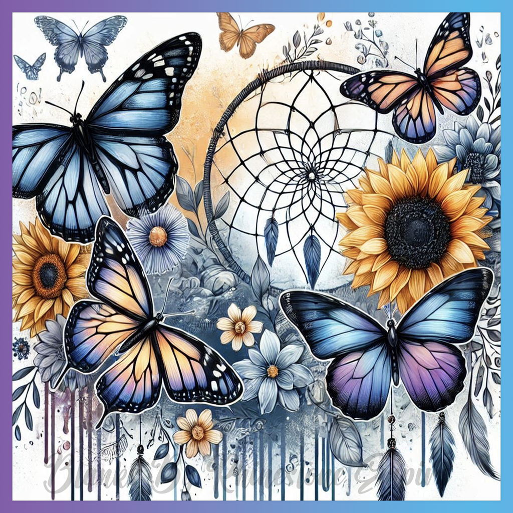 Theme: Butterfly with dreamcatcher, sunflowers, flowers, blue.