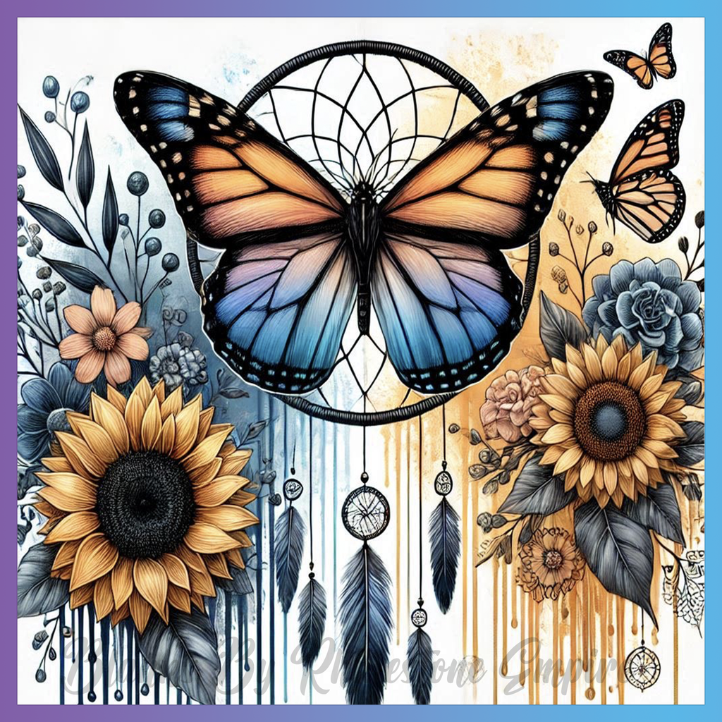 Theme: Butterfly with dreamcatcher, sunflowers, flowers, blue.